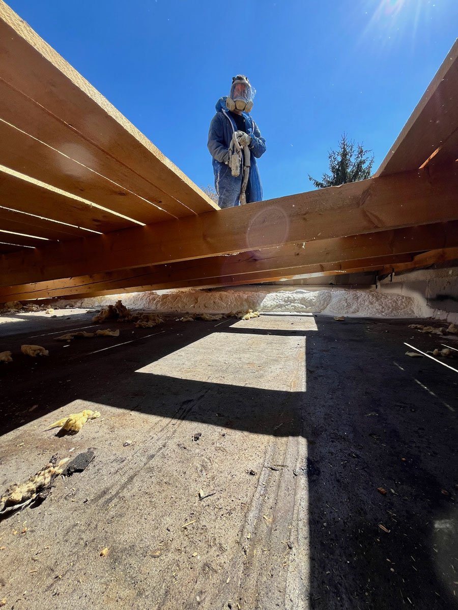 Realizace zakázky – odstranění staré poškozené střešní izolace a následné zateplení nad obytnou částí rodinného domu stříkanou pěnou s otevřenou strukturou v tloušťce 25 cm.