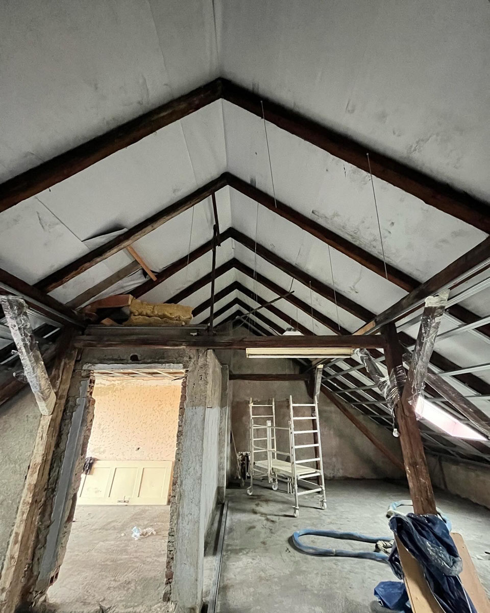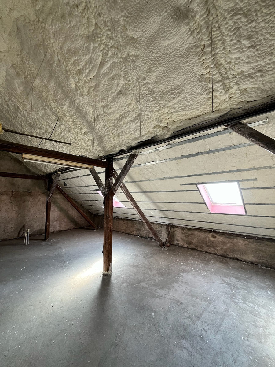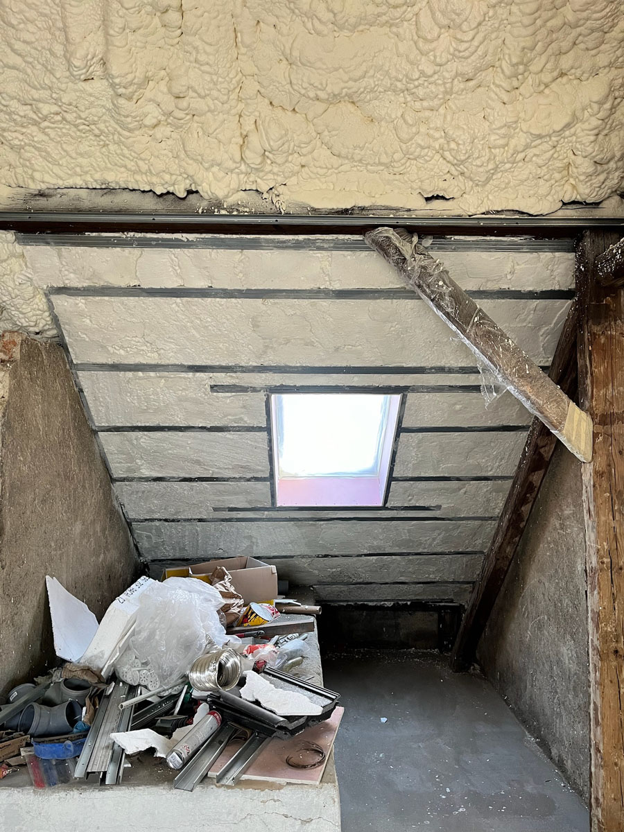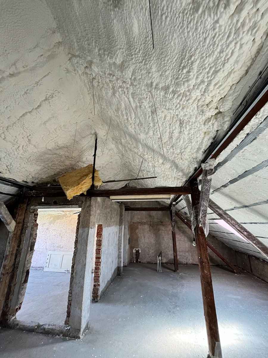 Realizace zakázky – zateplení podkrovního bytu v Brně-Černovicích stříkanou PUR pěnou s otevřenou buněčnou strukturou v tloušťce 20 cm.