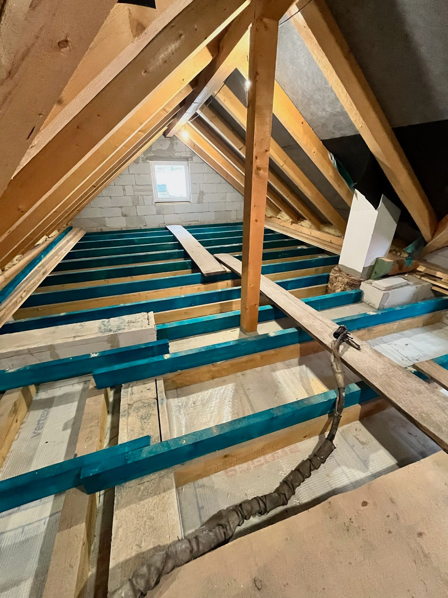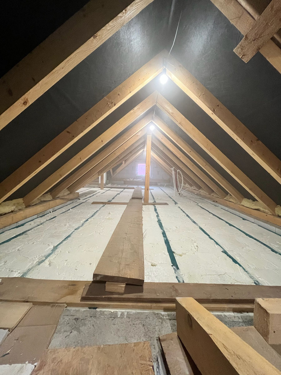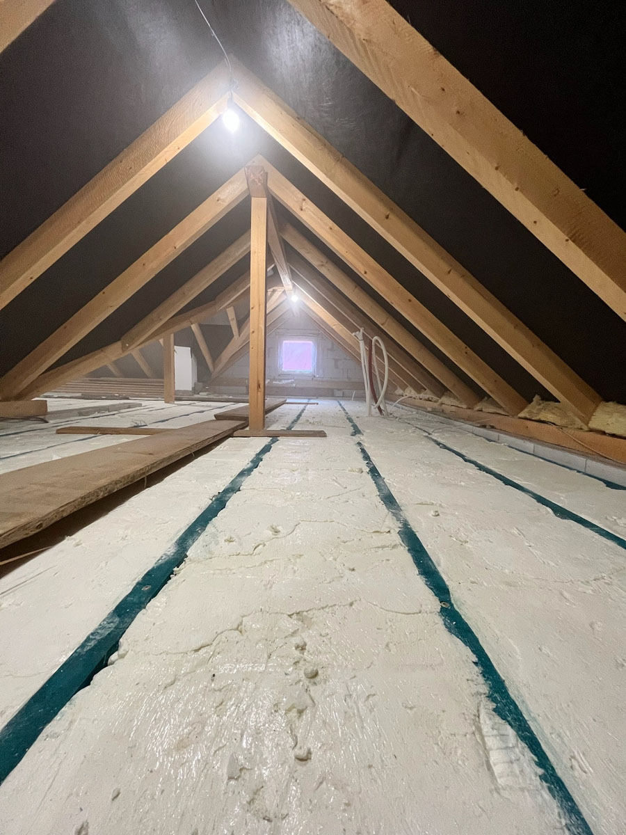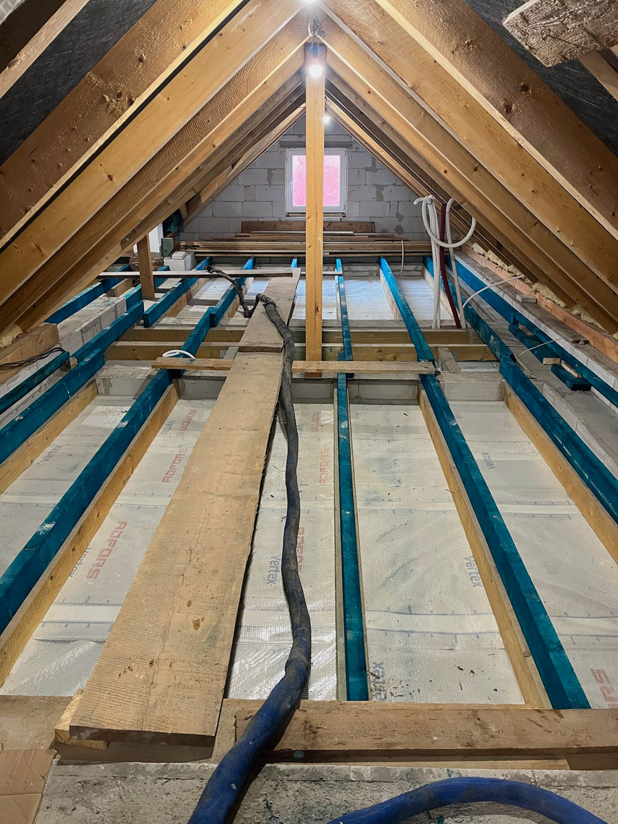 Realizace zakázky – zateplení podlahy v podkroví rodinného domu v Řeznovicích měkkou PUR pěnou s otevřenou buněčnou strukturou s vrstvou nástřiku 30 cm.