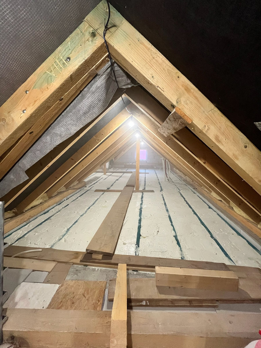 Zateplení podkroví bungalovu měkkou PUR pěnou.