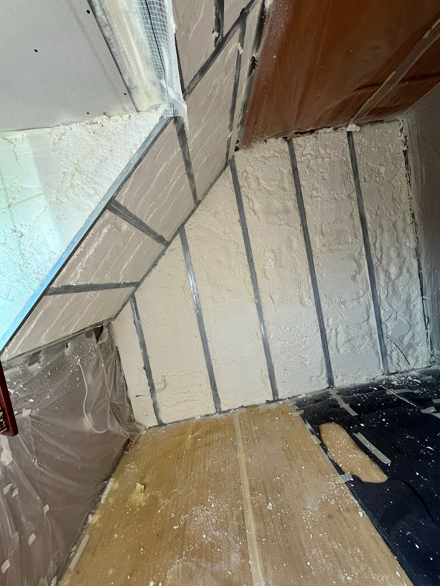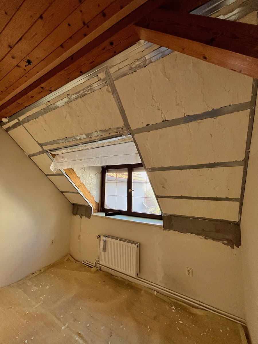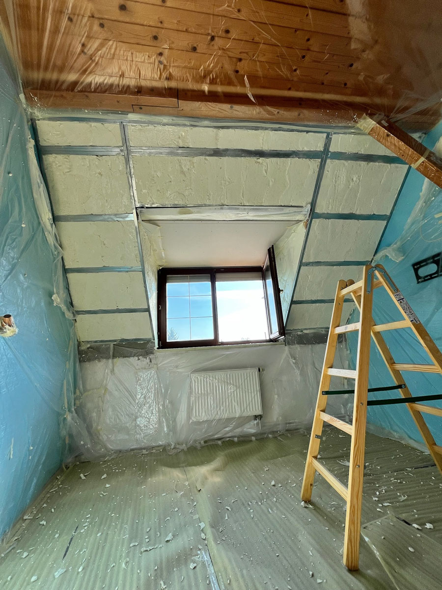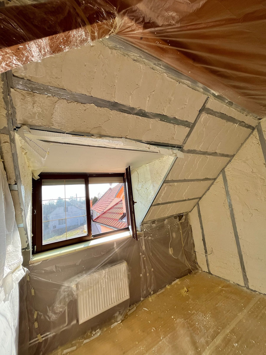 Zateplení podkroví bungalovu měkkou PUR pěnou.