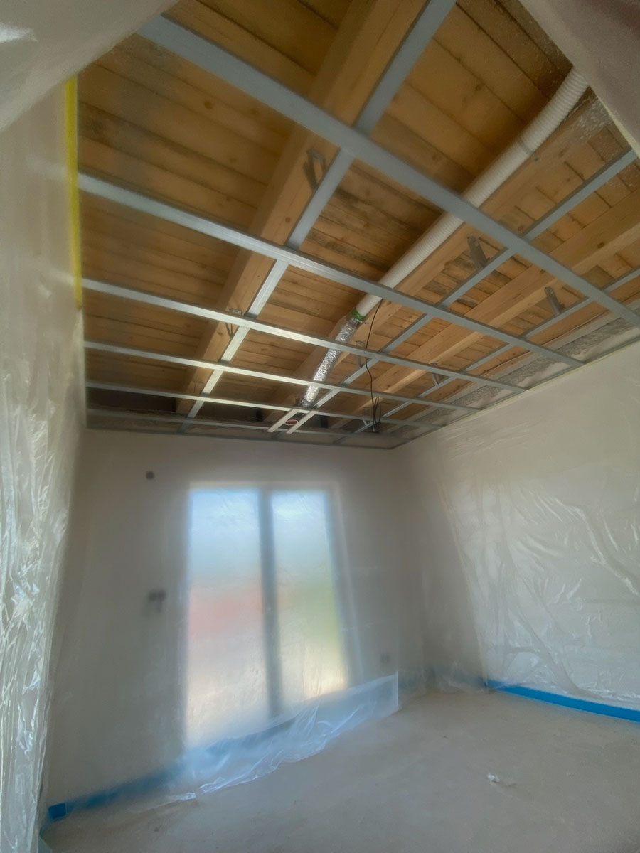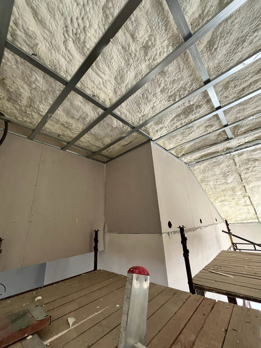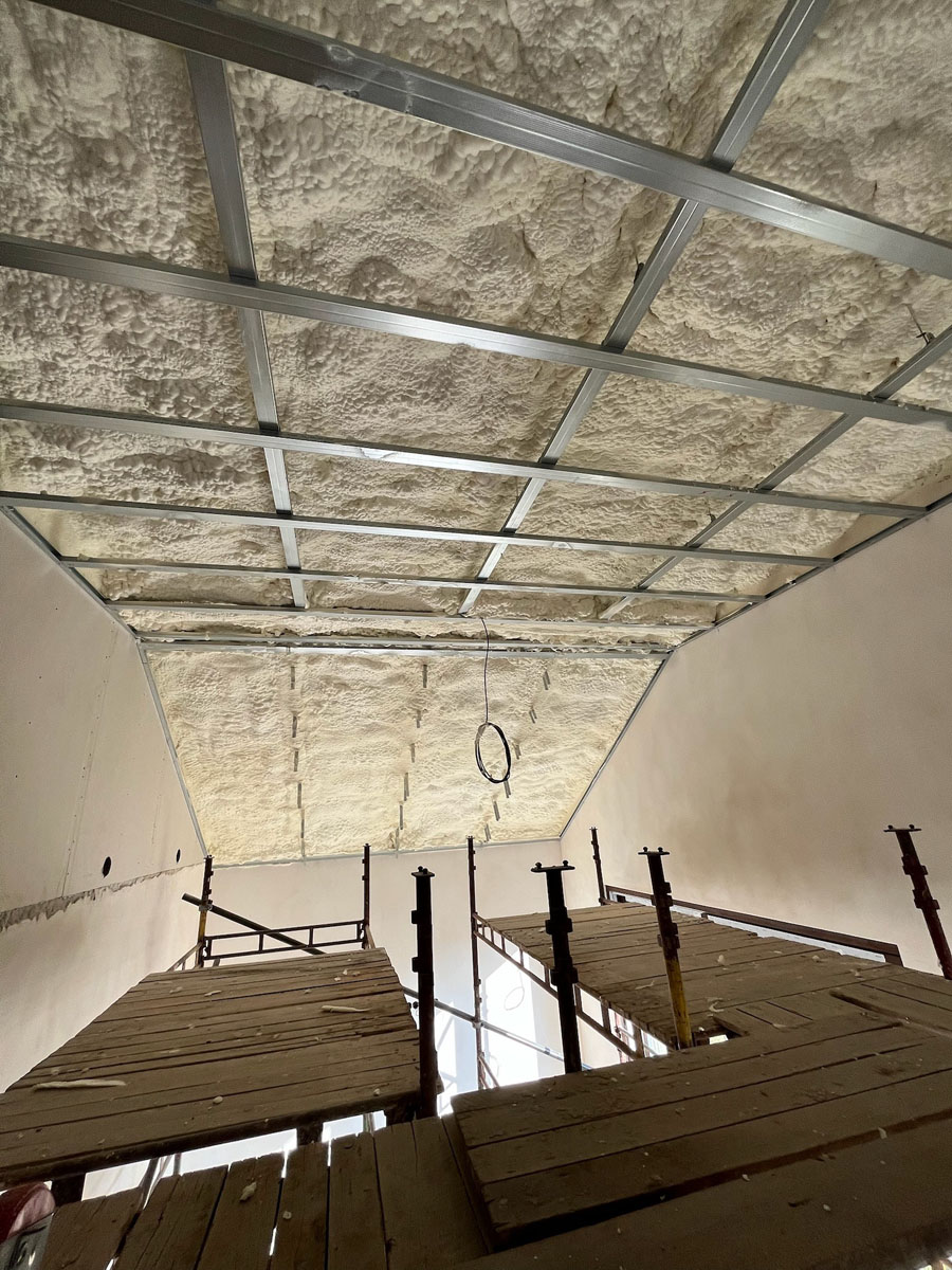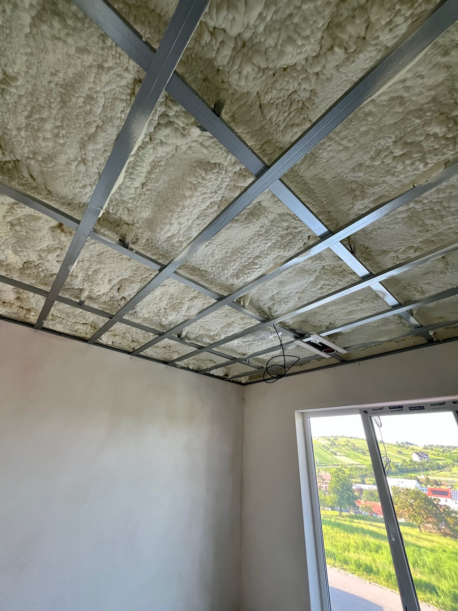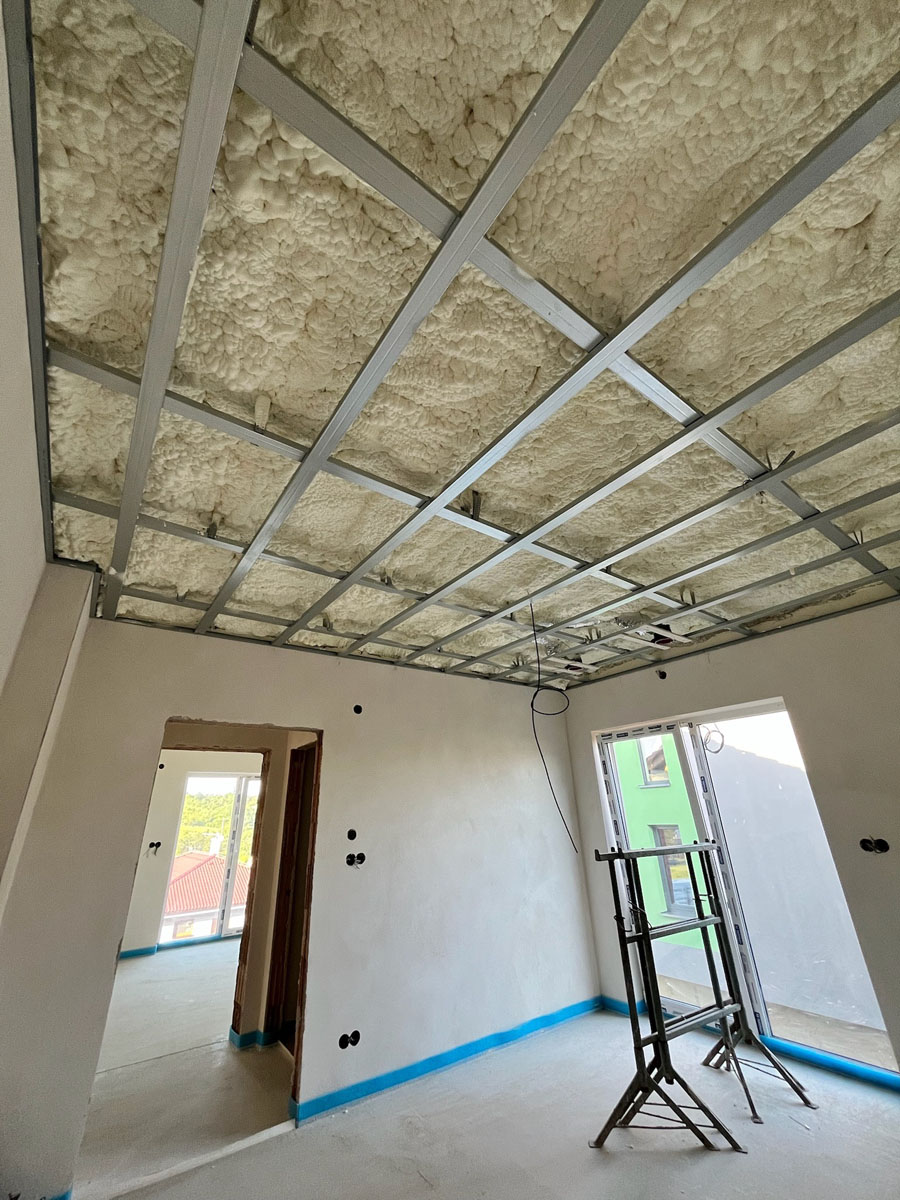 Realizace zakázky – zateplení stropu rodinného domu o ploše 150 m² měkkou PUR pěnou v síle nástřiku 30 cm.